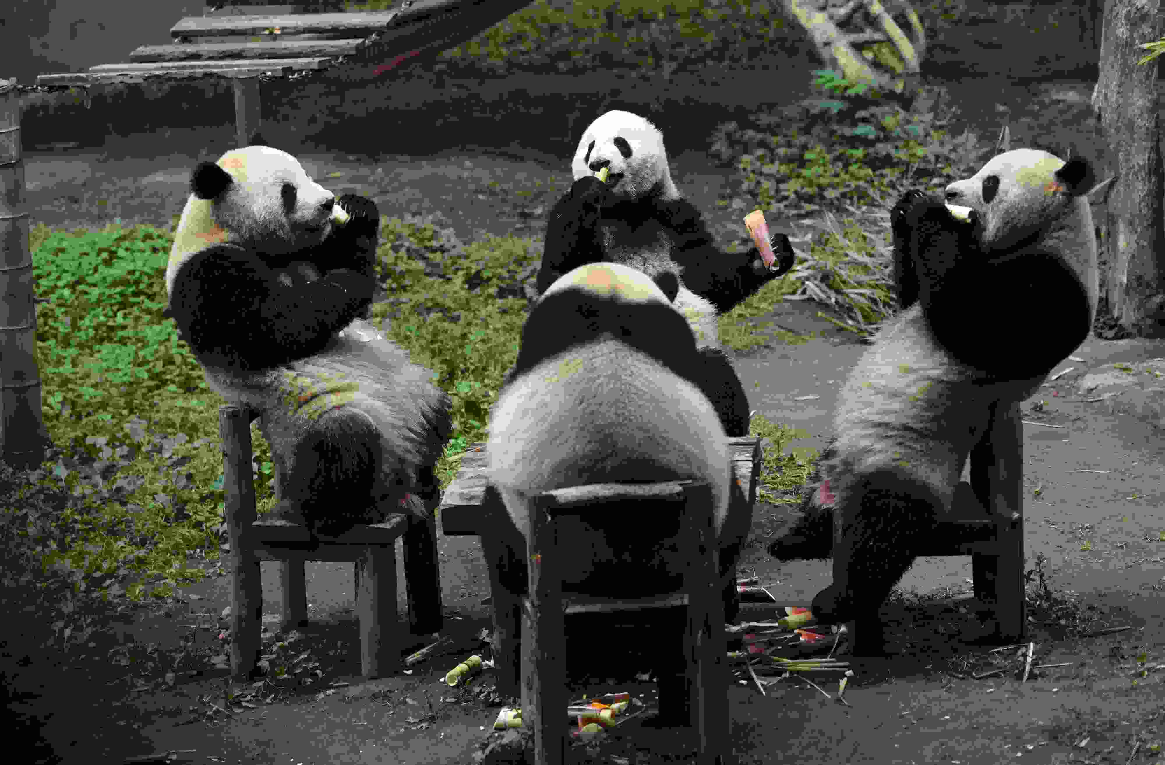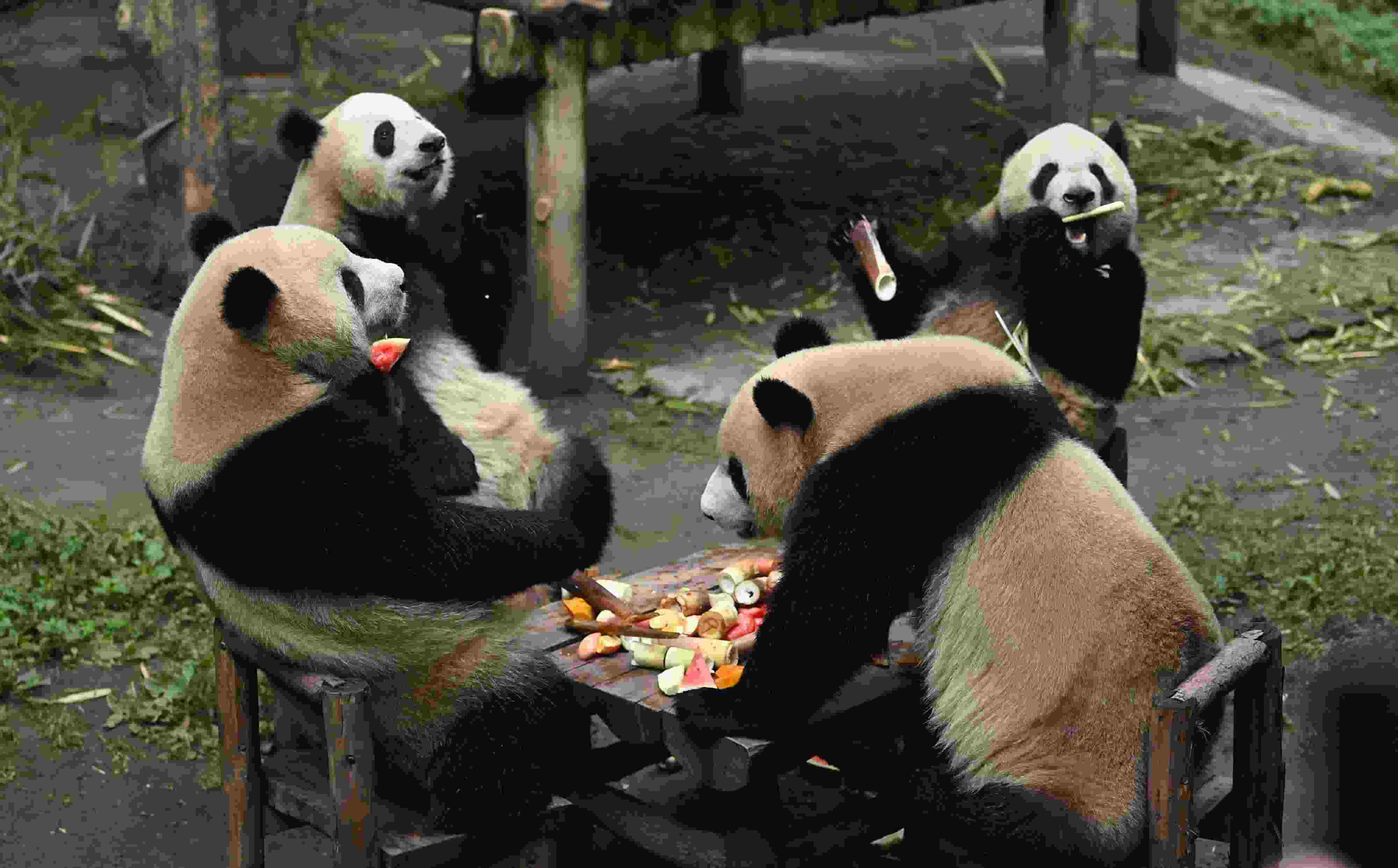 2023年5月21日,在重慶動物園內(nèi),大熊貓圍桌而坐,享用美食,萌態(tài)十足。 視覺中國