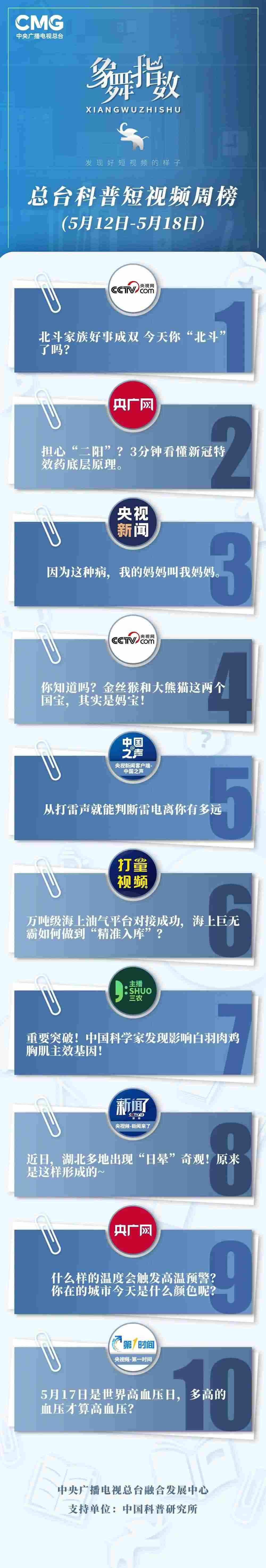 中央廣播電視總臺(tái)“象舞指數(shù)”評(píng)議品牌,推出科普短視頻周榜、總臺(tái)科普短視頻周榜。在2023年5月12日-5月18日,值得注目的內(nèi)容有: