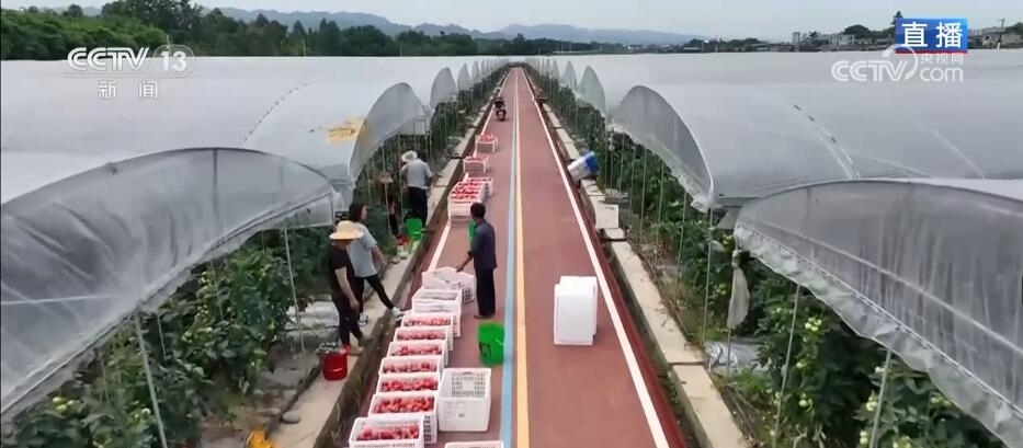 總臺(tái)記者 蔣林:歡迎各位繼續(xù)跟隨著我們?cè)谒拇纯础叭摹睍r(shí)節(jié)的農(nóng)忙景象。此刻我從平原地區(qū)的水稻高標(biāo)準(zhǔn)農(nóng)田來到了金銀河村的蔬菜種植產(chǎn)業(yè)園。通過空中航拍的畫面大家可以看到,金銀河村緊臨著長(zhǎng)江的三級(jí)支流青衣江,歷史上的金銀河村就是來自青衣江的沖刷和堆積,村里的土地含沙量高,土壤保水能力不夠,不適合栽種像水稻這樣的需要農(nóng)田蓄水、保水的作物。當(dāng)然,這樣的土地對(duì)于很多蔬菜品種來說,卻是絕佳好地,當(dāng)?shù)匾虻刂埔烁闫鹆怂竞褪卟斯灿械默F(xiàn)代產(chǎn)業(yè)園區(qū)。在這個(gè)園區(qū),適合蔬菜種植的面積達(dá)到7萬(wàn)畝,平均一年能種三季蔬菜,大大提升了土地產(chǎn)出與利用效果,也保證了每一個(gè)人的“菜籃子”。眼下,今年春天播種的番茄、黃瓜、茄子、豇豆等眾多時(shí)令蔬菜陸續(xù)成熟,新鮮上市,讓我們感受到初夏時(shí)節(jié)的豐收景象。