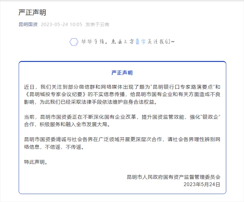 ·昆明市國資委發(fā)布聲明,“昆明銀行口專家路演要點”和《昆明城投專家會議紀(jì)要》不實。