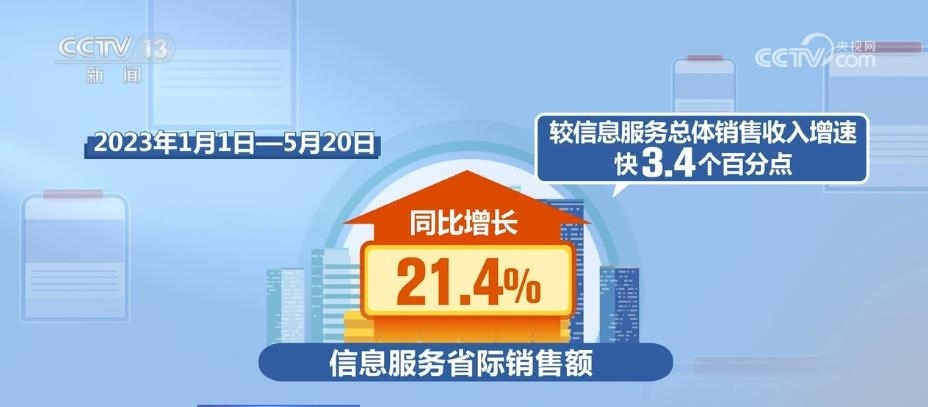 從信息方面來(lái)看,2017年—2022年,全國(guó)信息服務(wù)省際銷售額年均增長(zhǎng)22%,較信息服務(wù)總體銷售收入增速快2.8個(gè)百分點(diǎn)。2023年1月1日—5月20日,信息服務(wù)省際銷售額同比增長(zhǎng)21.4%,較信息服務(wù)總體銷售收入增速快3.4個(gè)百分點(diǎn)。