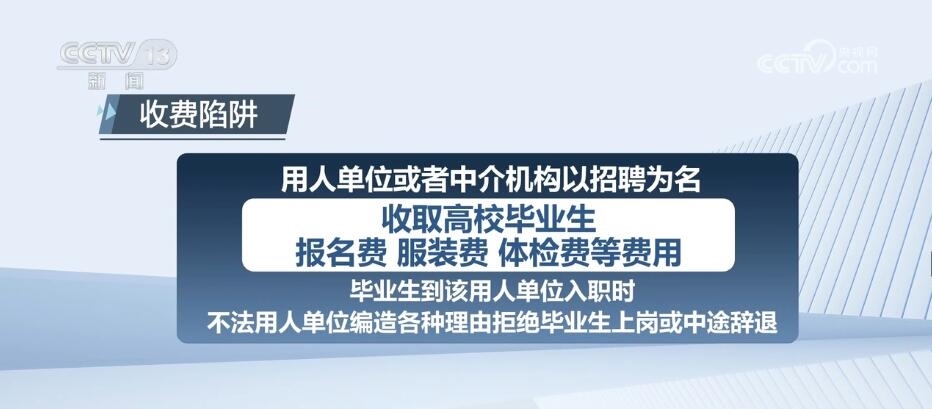 用人單位或者中介機(jī)構(gòu)以招聘為名,收取高校畢業(yè)生報名費(fèi)、服裝費(fèi)、體檢費(fèi)等費(fèi)用。畢業(yè)生到該用人單位入職時,不法用人單位編造各種理由拒絕畢業(yè)生上崗或中途辭退。