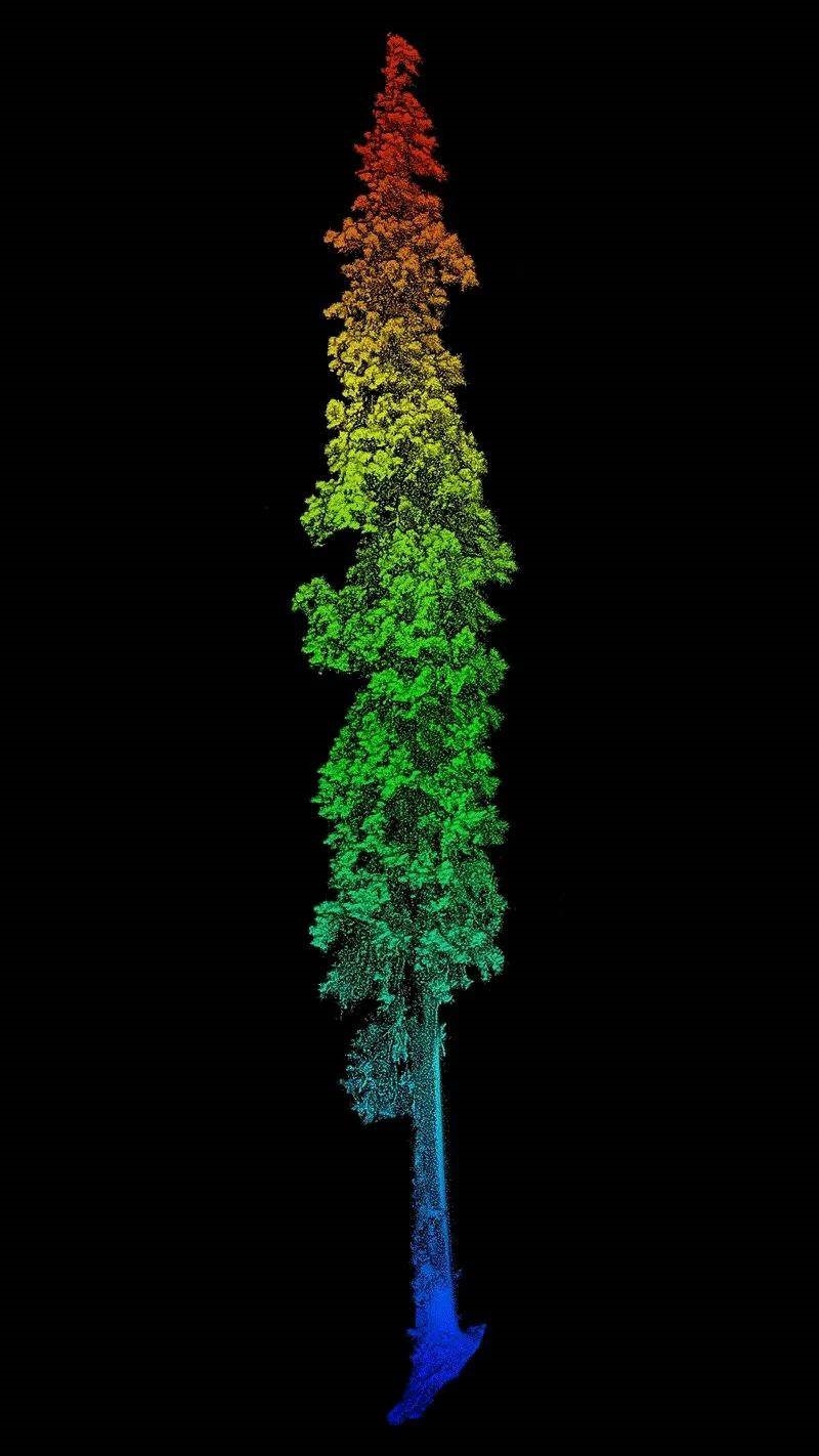 通過無人機與背包激光雷達相結(jié)合,對西藏柏木巨樹聚生區(qū)域進行精準測量,得到了巨樹群的精準三維點云模型。經(jīng)過高度測量,發(fā)現(xiàn)其中一棵西藏柏木高達102.3米,該發(fā)現(xiàn)同時刷新了中國與亞洲的最高樹紀錄,躋身按樹種排名的世界最高樹列表,位列第二。研究團隊獲取了該樹的精細三維點云數(shù)據(jù),測量其胸徑為293厘米,并采用無人機攝影的方式獲取了巨樹等身照。