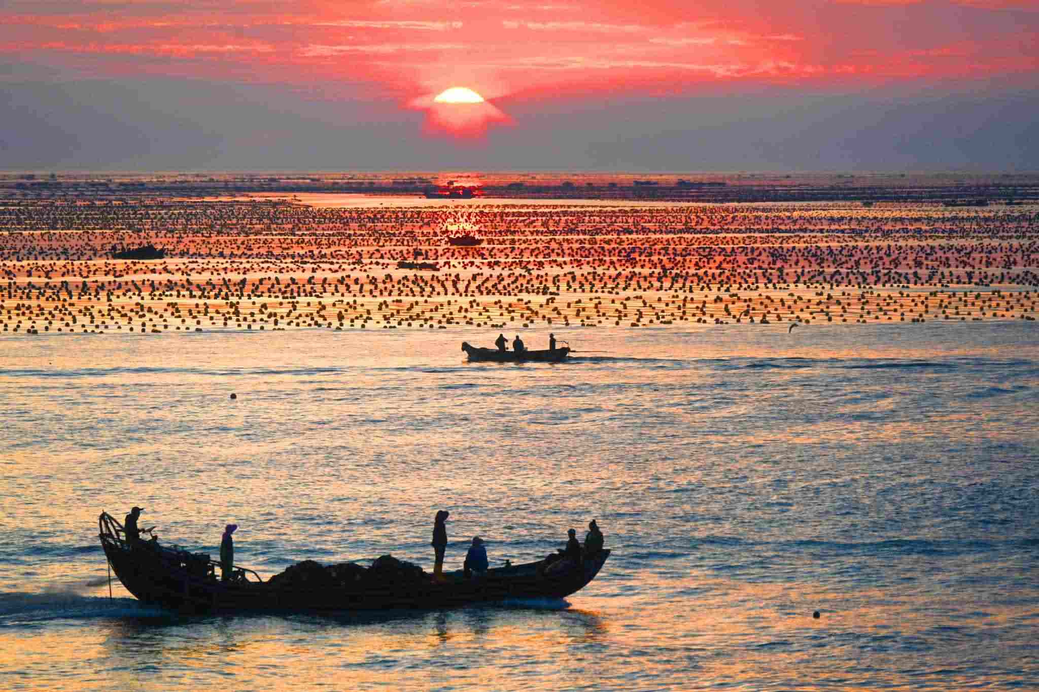 2023年5月31日,山東威海,榮成愛(ài)倫灣海洋牧場(chǎng),漁民駕駛船只在海上收獲海帶,美麗的朝霞倒影在海上,海鷗伴舞,海洋牧場(chǎng)到處呈現(xiàn)一派豐收的喜人景象。視覺(jué)中國(guó)