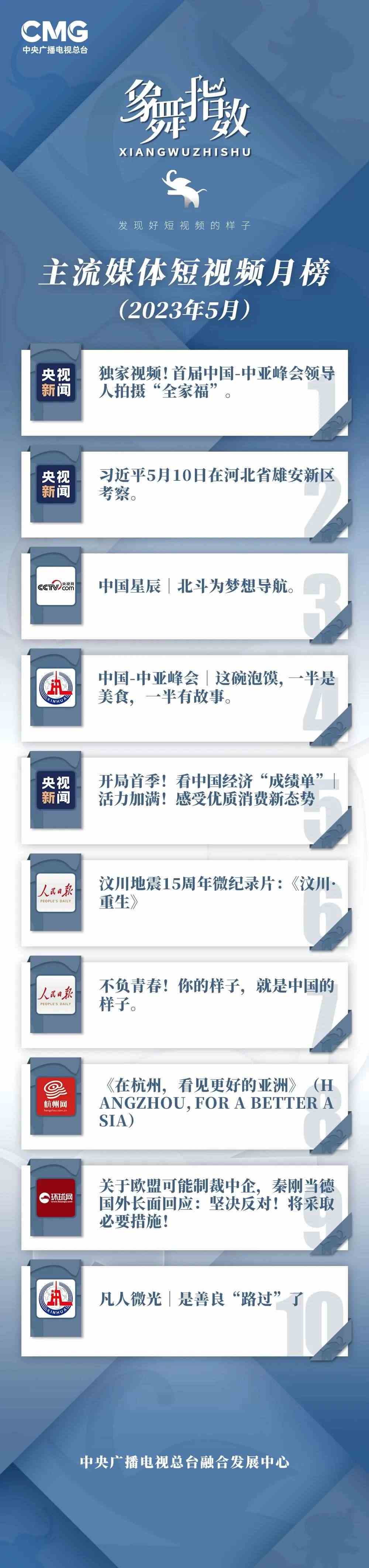 中央廣播電視總臺(tái)“象舞指數(shù)”評(píng)議品牌,推出主流媒體短視頻月榜、總臺(tái)短視頻月榜。在2023年5月,這些內(nèi)容引發(fā)大眾關(guān)注: