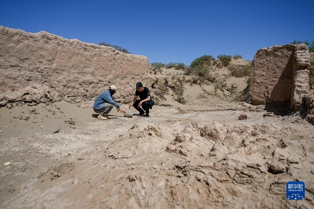 6月2日,額濟納旗文物保護中心工作人員在居延遺址附近查看散落的石碾。