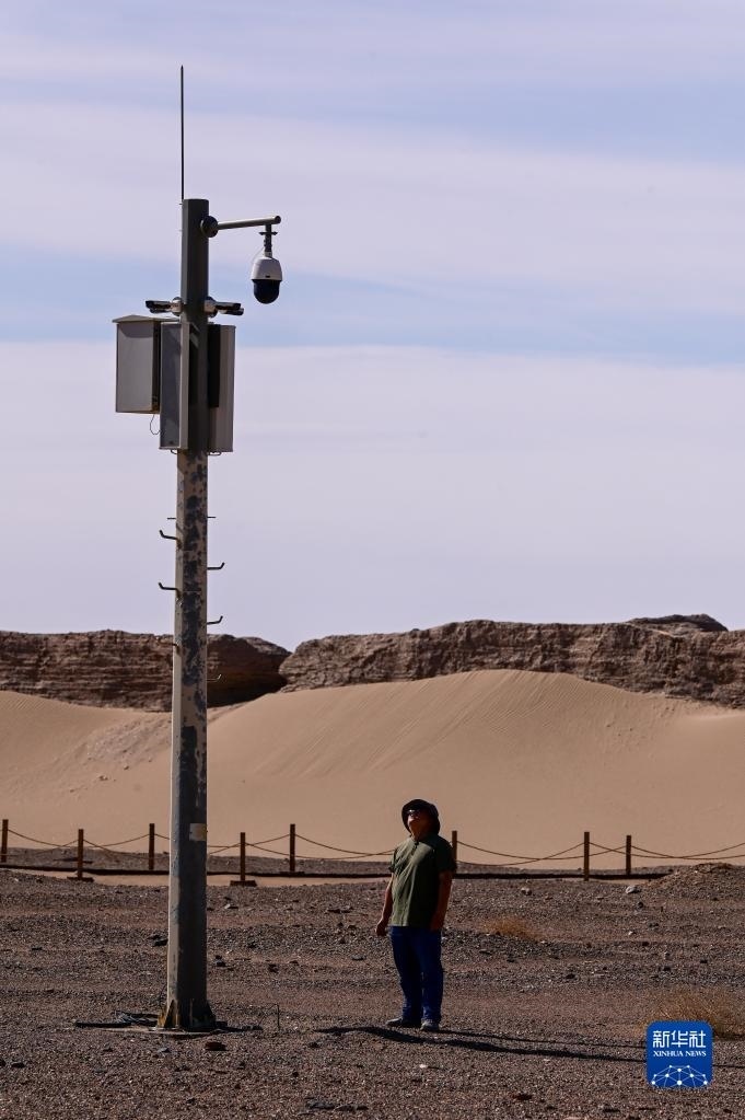 6月2日,額濟納旗文物保護中心工作人員在黑城遺址察看文保監(jiān)控設備工作情況。