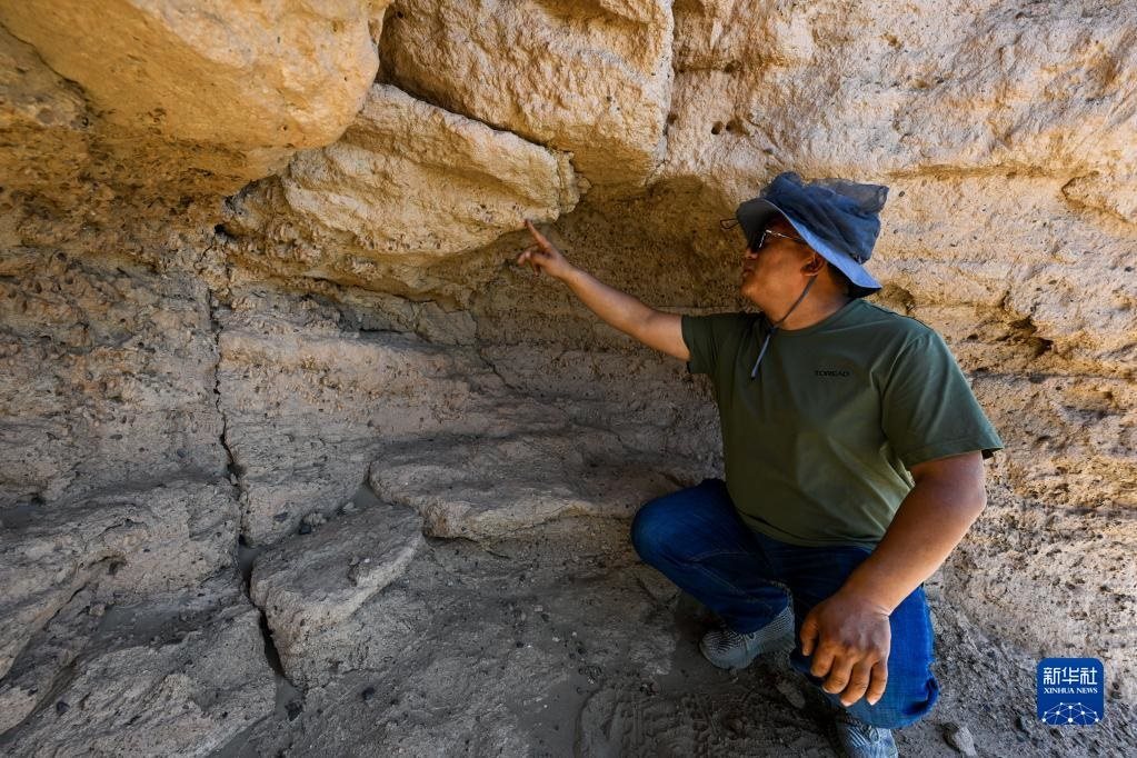 6月2日,額濟納旗文物保護中心工作人員在居延遺址附近查看散落的陶片。