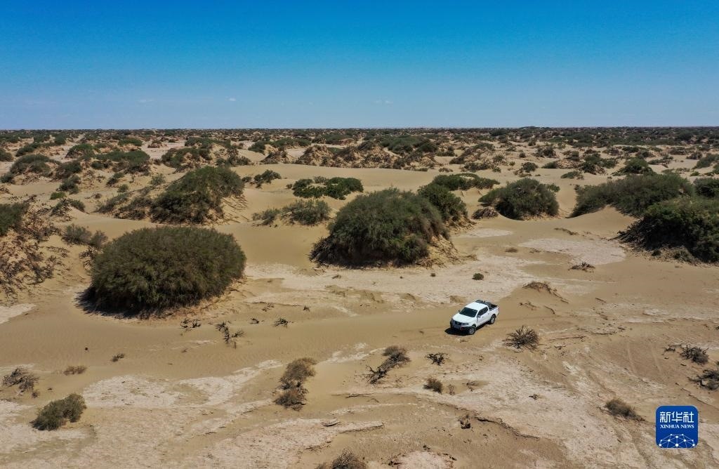 6月2日,額濟納旗文物保護中心工作人員在戈壁灘上巡護(無人機照片)。