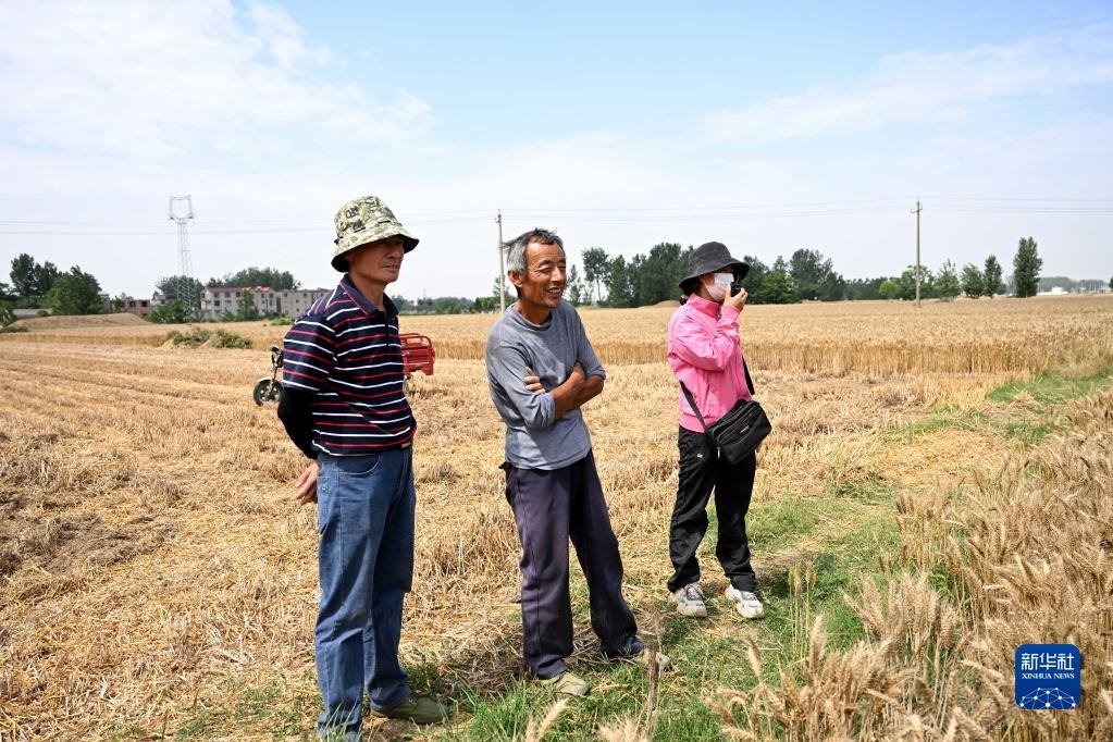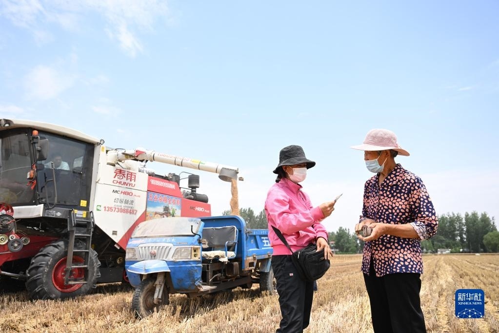 6月2日,在安徽省阜陽(yáng)市阜南縣許堂鄉(xiāng)劉崗村,陳麗娟和村民確認(rèn)收割費(fèi)用。