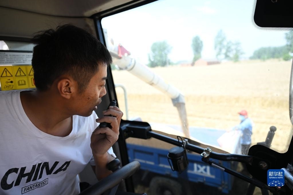 6月2日,在安徽省阜陽(yáng)市阜南縣許堂鄉(xiāng)劉崗村,董斐斐駕駛收割機(jī)為村民收割小麥。