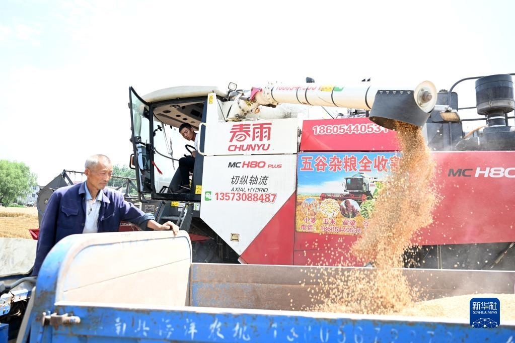 6月2日,在安徽省阜陽(yáng)市阜南縣許堂鄉(xiāng)劉崗村,董斐斐駕駛收割機(jī)將收割的小麥裝車(chē)。
