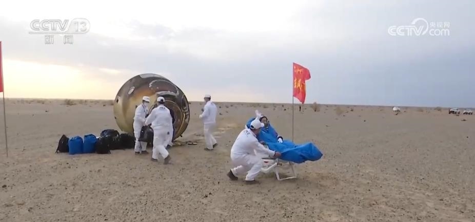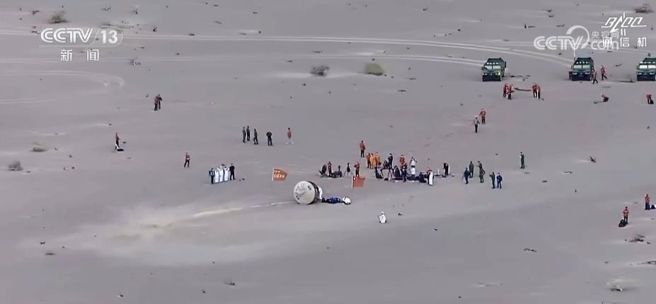 返回艙成功著陸,擔(dān)負(fù)搜救回收任務(wù)的搜救分隊(duì)及時(shí)發(fā)現(xiàn)目標(biāo)并抵達(dá)著陸現(xiàn)場。