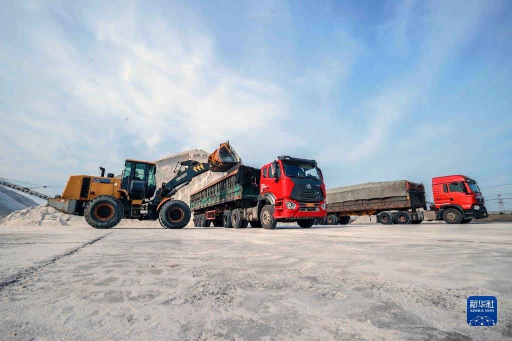 6月4日,工人操作設(shè)備在唐山海港經(jīng)濟開發(fā)區(qū)長蘆大清河鹽場將海鹽裝車,準備外運。