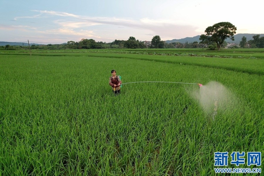 在廣昌縣頭陂鎮(zhèn)山下村,種植戶正在噴灑農(nóng)藥,進行防治病蟲害作業(yè)。新華網(wǎng)發(fā) 危仁鵬 攝