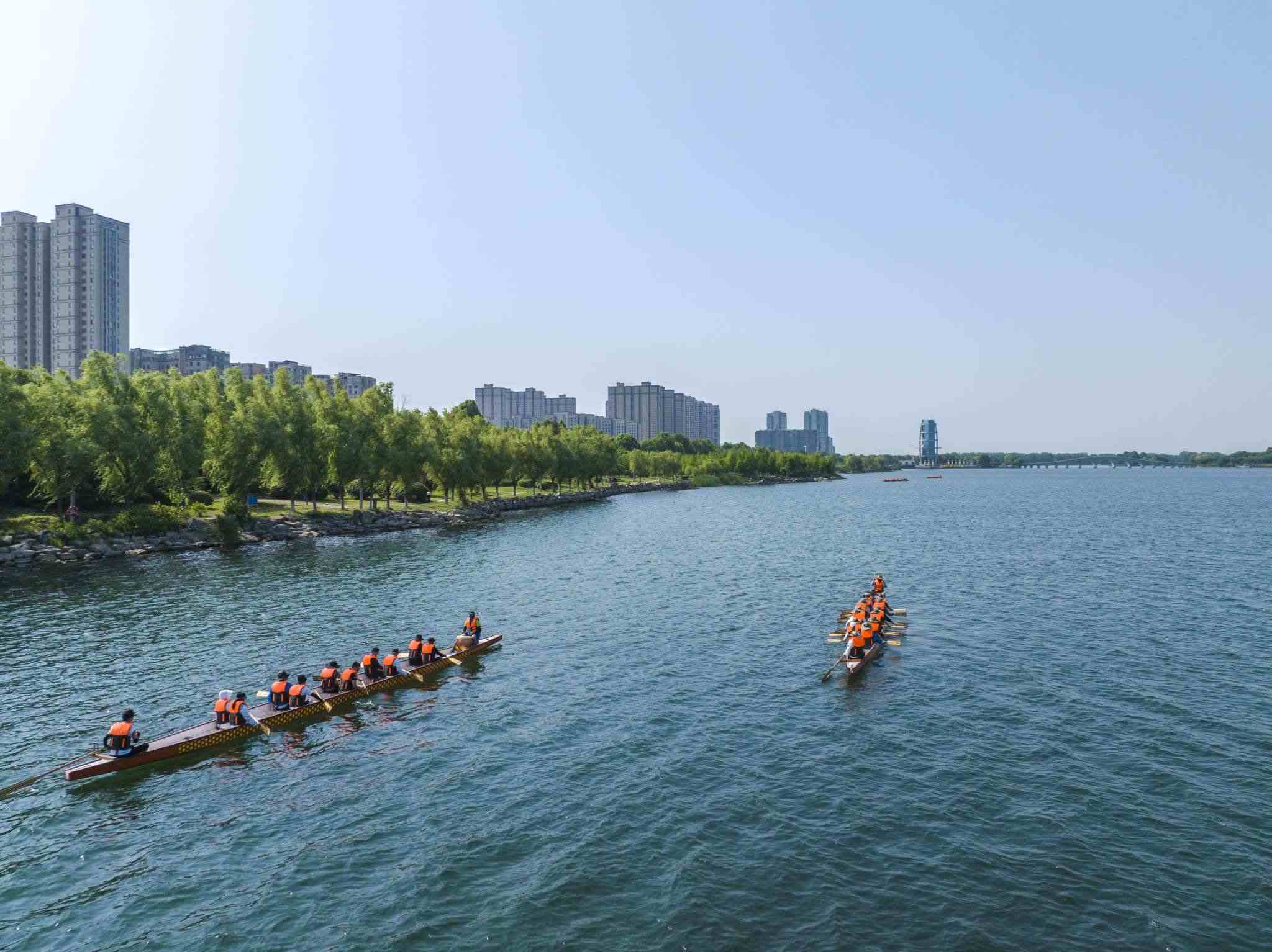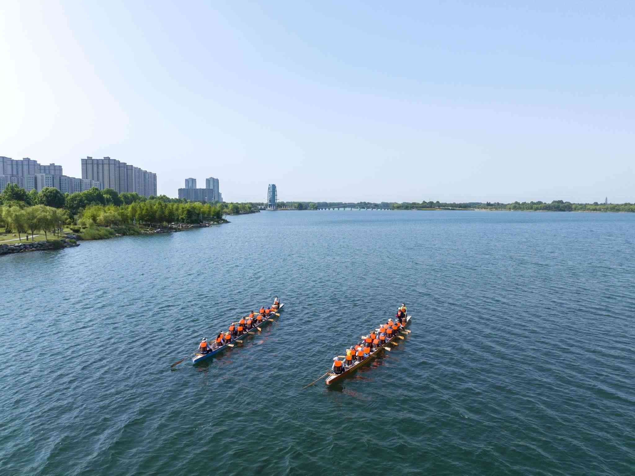 2023年6月8日,江蘇連云港,東海縣西雙湖風景區(qū),多支龍舟隊在西雙湖水域進行訓練,積極備戰(zhàn)端午龍舟賽。視覺中國