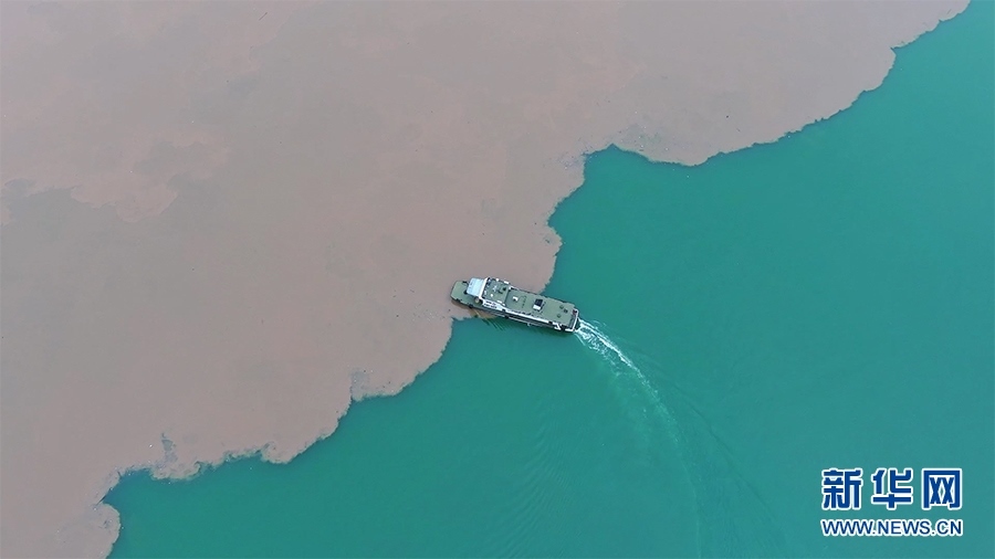受近期長江上游持續(xù)降雨影響,位于重慶涪陵的長江與烏江交匯處,兩江因含沙量不同而顏色對比鮮明,形成猶如重慶火鍋中“鴛鴦鍋”景觀。新華網(wǎng)發(fā) (夏雷 攝)