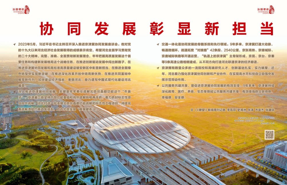 ◇2023年5月,習(xí)近平總書記主持召開深入推進京津冀協(xié)同發(fā)展座談會。他對黨的十九大以來河北經(jīng)濟社會發(fā)展取得的成績表示肯定,希望河北全面學(xué)習(xí)貫徹黨的二十大精神,完整、準確、全面貫徹新發(fā)展理念,牢牢把握高質(zhì)量發(fā)展這個首要任務(wù)和構(gòu)建新發(fā)展格局這個戰(zhàn)略任務(wù),在推進創(chuàng)新驅(qū)動發(fā)展中闖出新路子,在推進京津冀協(xié)同發(fā)展和高標準高質(zhì)量建設(shè)雄安新區(qū)中彰顯新?lián)?,在推進全面綠色轉(zhuǎn)型中實現(xiàn)新突破,在推進深化改革開放中培育新優(yōu)勢,在推進共同富裕中展現(xiàn)新作為,加快建設(shè)經(jīng)濟強省、美麗河北,奮力譜寫中國式現(xiàn)代化建設(shè)河北篇章。