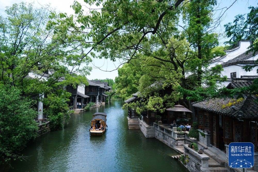 游客乘船在浙江嘉興桐鄉(xiāng)市濮院鎮(zhèn)的濮院時(shí)尚古鎮(zhèn)游覽(5月2日攝)。濮院時(shí)尚古鎮(zhèn)以“歷史街區(qū)再利用”的概念經(jīng)過10年的升級改造而成,擁有典型的江南水鄉(xiāng)地貌特征,成功創(chuàng)建為浙江省級5A級景區(qū)鎮(zhèn)。新華社記者 徐昱 攝