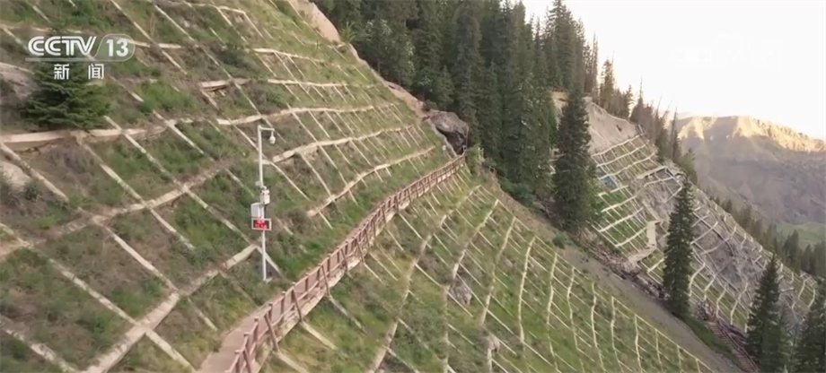 天池的水來自于天山深處的冰川融水,由南向北形成多條瀑布、河流,一路向山下奔流,成為當(dāng)?shù)刂匾霓r(nóng)業(yè)灌溉水源,滋養(yǎng)著下游80多萬畝土地。我們現(xiàn)在看到這些鋪在山野中的網(wǎng)格,就是當(dāng)?shù)卣谶M行的生態(tài)修復(fù)與地質(zhì)災(zāi)害防治工程,人們在這些網(wǎng)格間播撒草籽,來穩(wěn)定區(qū)域生態(tài)環(huán)境,有效防范地質(zhì)災(zāi)害的發(fā)生。