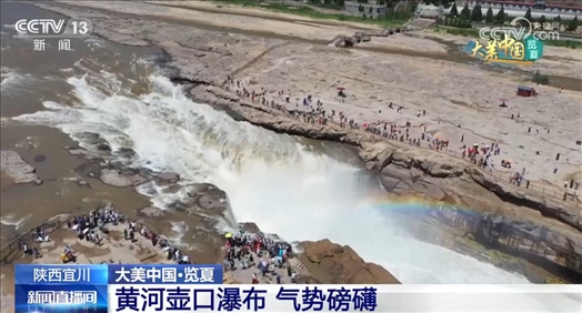 這是從陜西延安宜川縣拍攝到的黃河壺口瀑布。進(jìn)入夏季,壺口瀑布水位逐漸上升,水流開始增大,迎來夏季最佳觀賞期。從空中俯瞰,主瀑布波浪翻滾,氣勢(shì)磅礴,水霧在陽光的照射下形成彩虹。