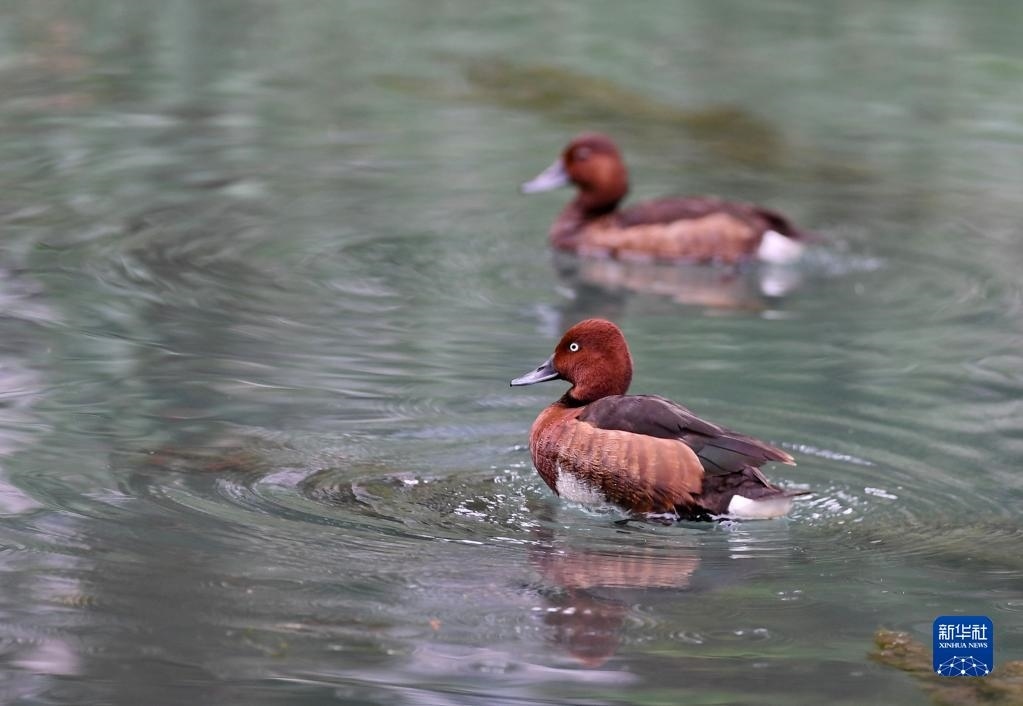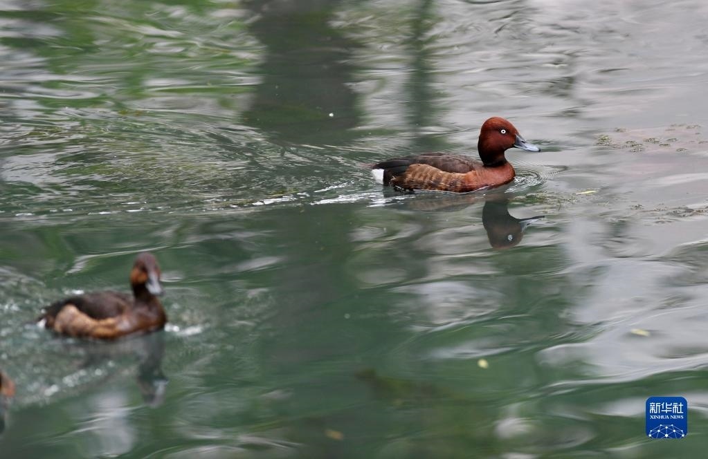 夏日里,白眼潛鴨和鳳頭潛鴨在西藏拉薩市拉魯濕地國家級自然保護(hù)區(qū)中干渠里覓食、嬉戲。新華社記者 張汝鋒 攝