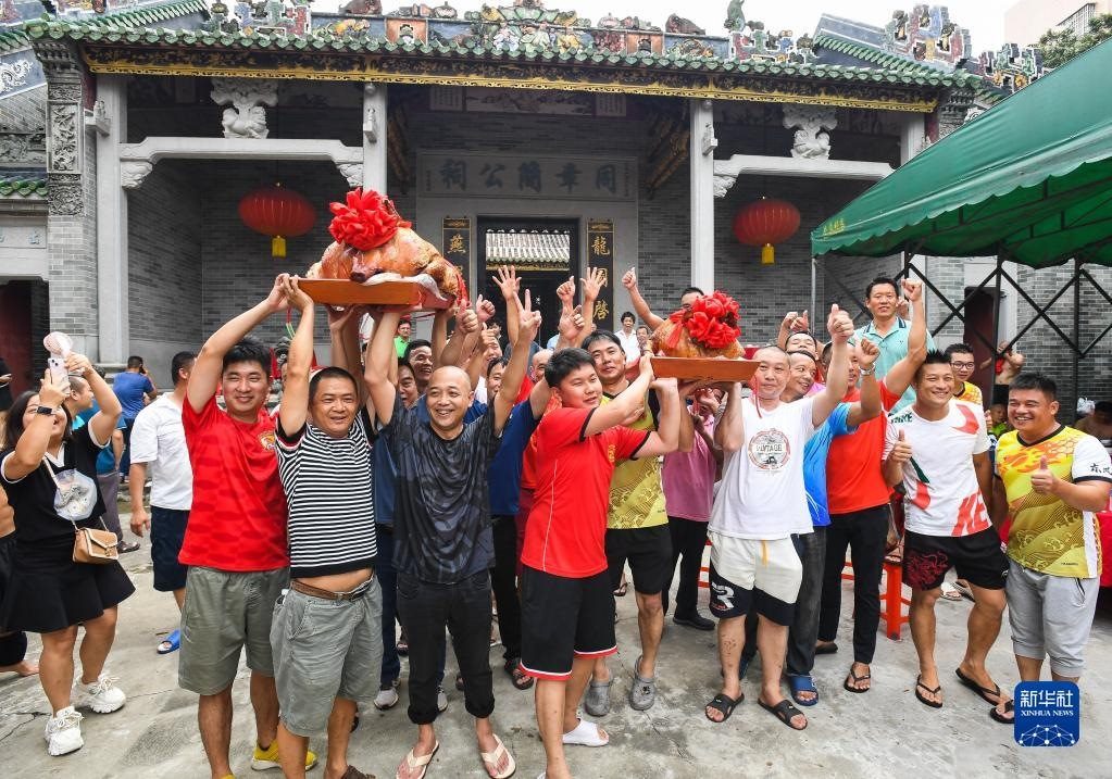 6月15日,2023年車陂龍舟競(jìng)渡第一名“范陽(yáng)簡(jiǎn)”龍船會(huì)的成員們?cè)诩异羟疤е?jiǎng)品燒豬慶祝。