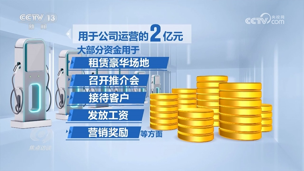 用于公司運營的2億元,大部分資金用于租賃豪華場地、召開推介會、接待客戶、發(fā)放工資、營銷獎勵等方面。實際僅修建充電樁123個,用資僅1000多萬元,僅占資金總額的1%。