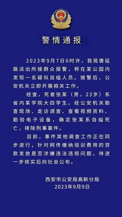 ·西安高新警方通報“大四學生自縊身亡”:排除刑案,正進一步核實網傳貸款問題。
