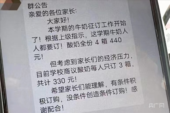 ·駐馬店正陽縣教育局發(fā)布關于正陽縣某學校涉嫌違規(guī)征訂學生飲用奶的調查情況通報:涉事班級解讀文件出現偏差。處理意見:立即暫停征訂工作,進行整頓規(guī)范,對相關責任人員進行調查。