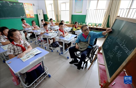 今年48歲的楊季剛是山東省棗莊市永安鎮(zhèn)遺棠小學一名鄉(xiāng)村教師,從教已28年。2017年初,楊季剛因意外摔成重傷,終生將與輪椅為伴??恐B強的毅力,歷經康復訓練的艱辛,2018年秋季楊季剛如期回到了校園,在特制1米高的小黑板上頑強地續(xù)寫他的教師生涯。
