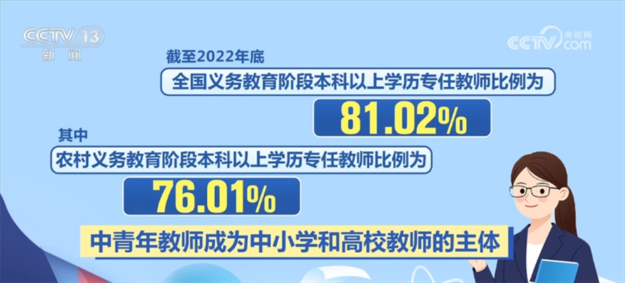 近年來,“特崗計劃”、“三區(qū)”人才支持計劃教師專項計劃等源源不斷地為鄉(xiāng)村學校補充高素質(zhì)教師。優(yōu)師計劃、師范教育協(xié)同提質(zhì)計劃、國優(yōu)計劃等的實施,也在助力優(yōu)秀教師的培養(yǎng)。我國各級各類教師隊伍學歷不斷提高、年齡結(jié)構(gòu)不斷優(yōu)化。截至2022年底,全國義務教育階段本科以上學歷專任教師比例為81.02%,其中,農(nóng)村義務教育階段本科以上學歷專任教師比例為76.01%,中青年教師成為中小學和高校教師的主體。
