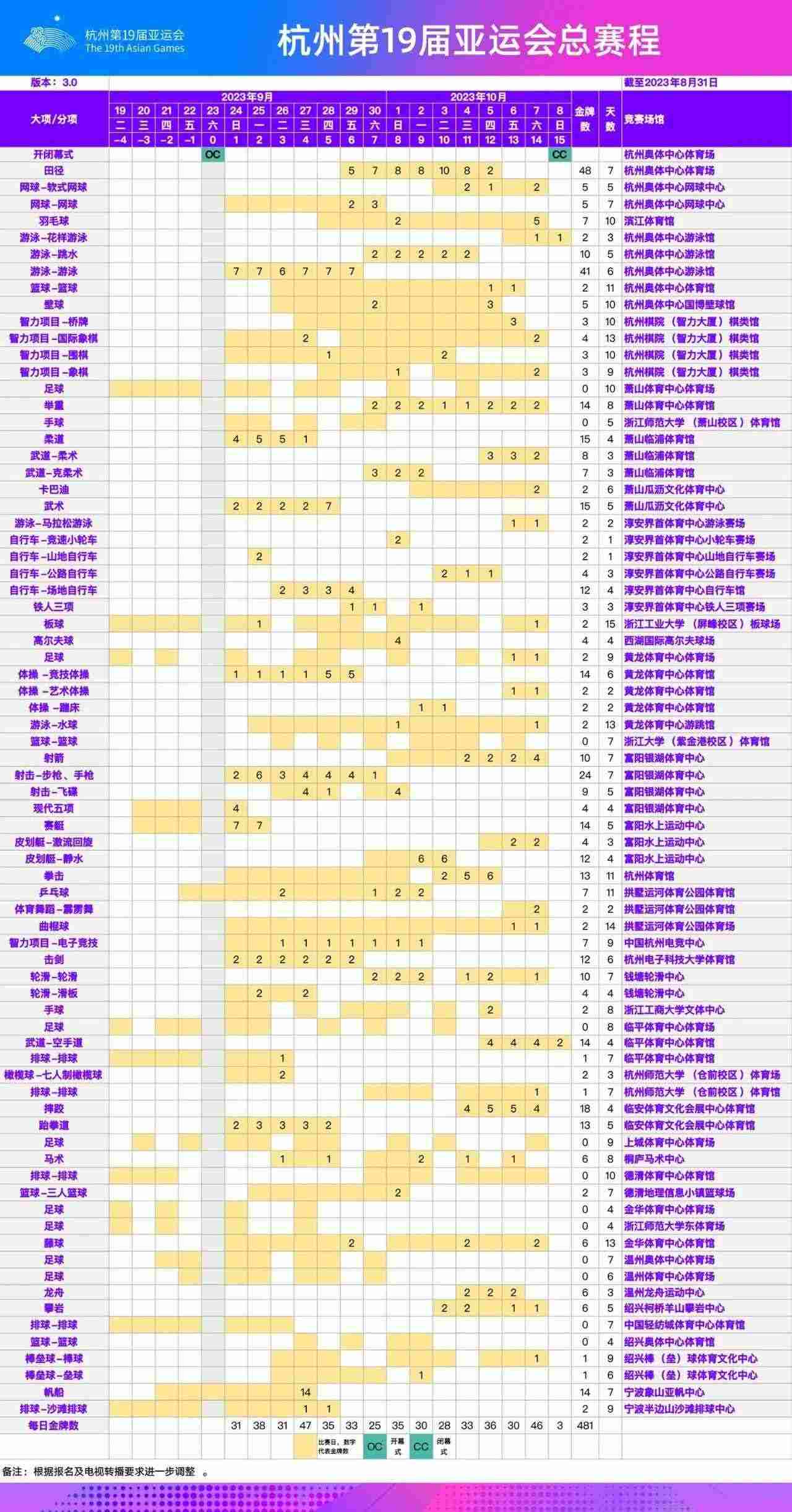 根據(jù)最新報(bào)名調(diào)整情況,經(jīng)杭州亞運(yùn)會(huì)各項(xiàng)目技術(shù)代表確認(rèn),杭州亞運(yùn)會(huì)總賽程已更新至3.0版。