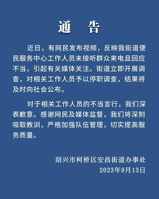 ·浙江紹興有市民發(fā)視頻稱,打不通安昌便民中心電話,來到現(xiàn)場(chǎng)發(fā)現(xiàn)工作人員都在聊天,吐槽電話是擺設(shè)。官方通報(bào):相關(guān)工作人員停職調(diào)查。