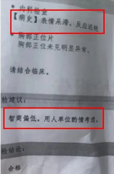 ·江蘇一醫(yī)院體檢報告上寫“智商偏低,用人單位酌情考慮”?涉事醫(yī)院回應(yīng):屬實,主檢醫(yī)生已被停職。