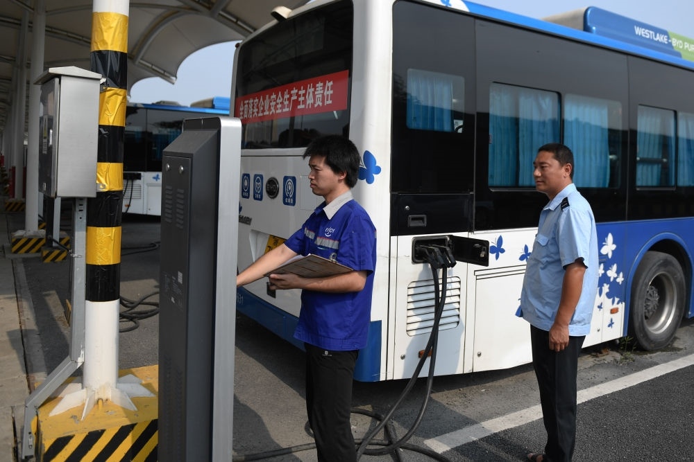 工作人員(左)在杭州公交電車(chē)公司拱康路維保站檢查純電動(dòng)公交車(chē)的充電情況。新華社記者黃宗治 攝