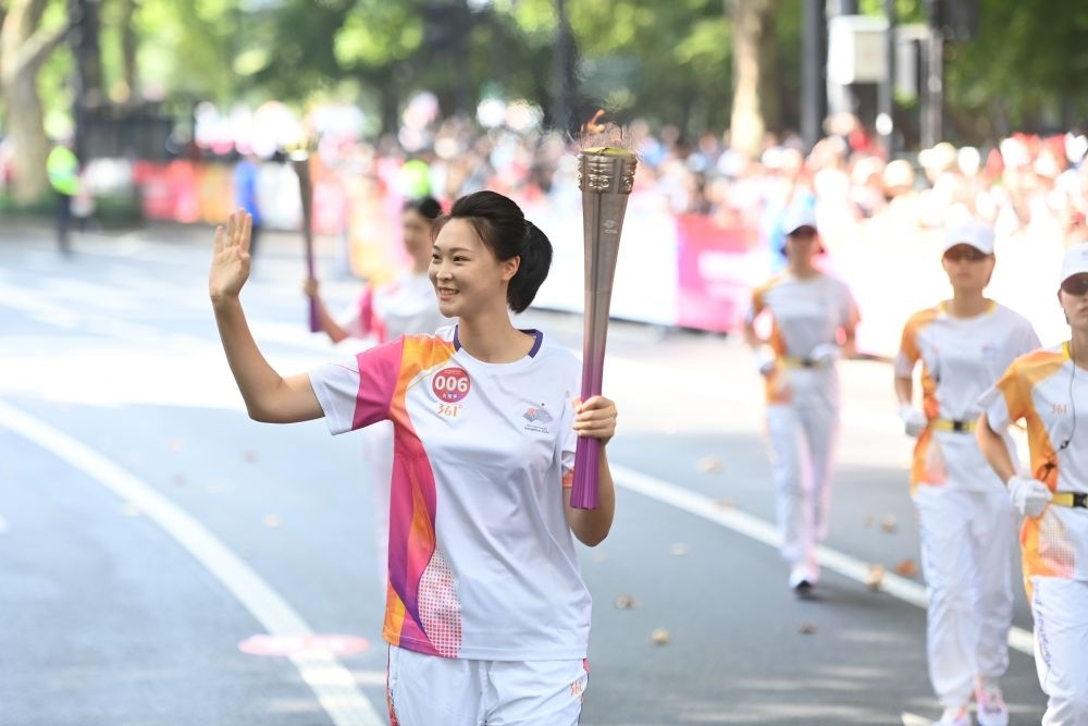 ↑火炬手方愉婷在火炬?zhèn)鬟f中。