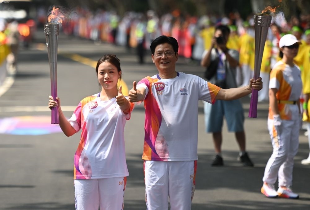 ↑火炬手葛庭輝(左)和章麗楠在火炬?zhèn)鬟f中。