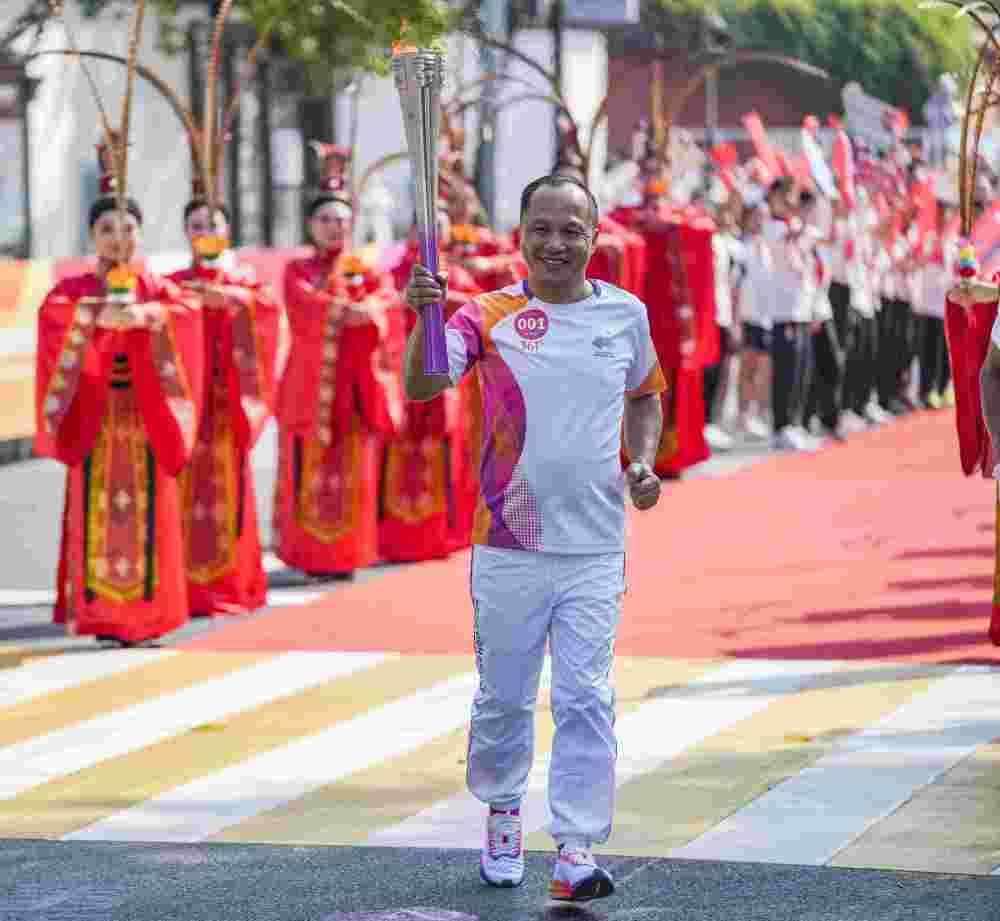 ↑火炬手蔡相理在火炬?zhèn)鬟f中。
