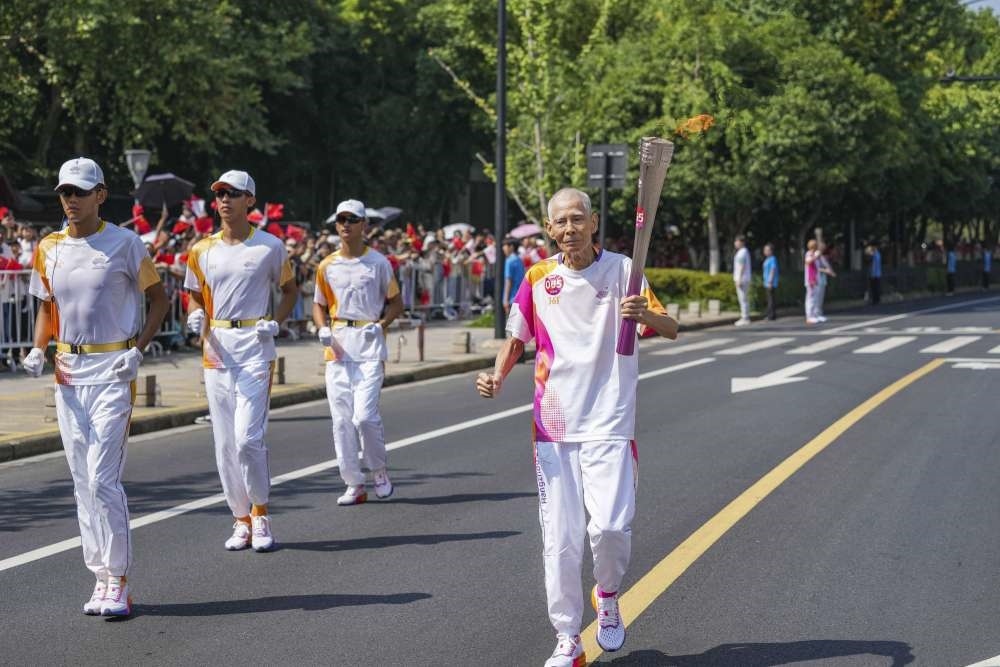 ↑火炬手李榮祥在杭州亞運(yùn)會(huì)火炬?zhèn)鬟f湖州站收火儀式上。