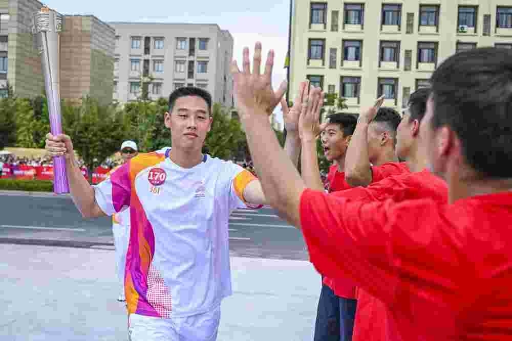 ↑火炬手王懿律在火炬?zhèn)鬟f中。