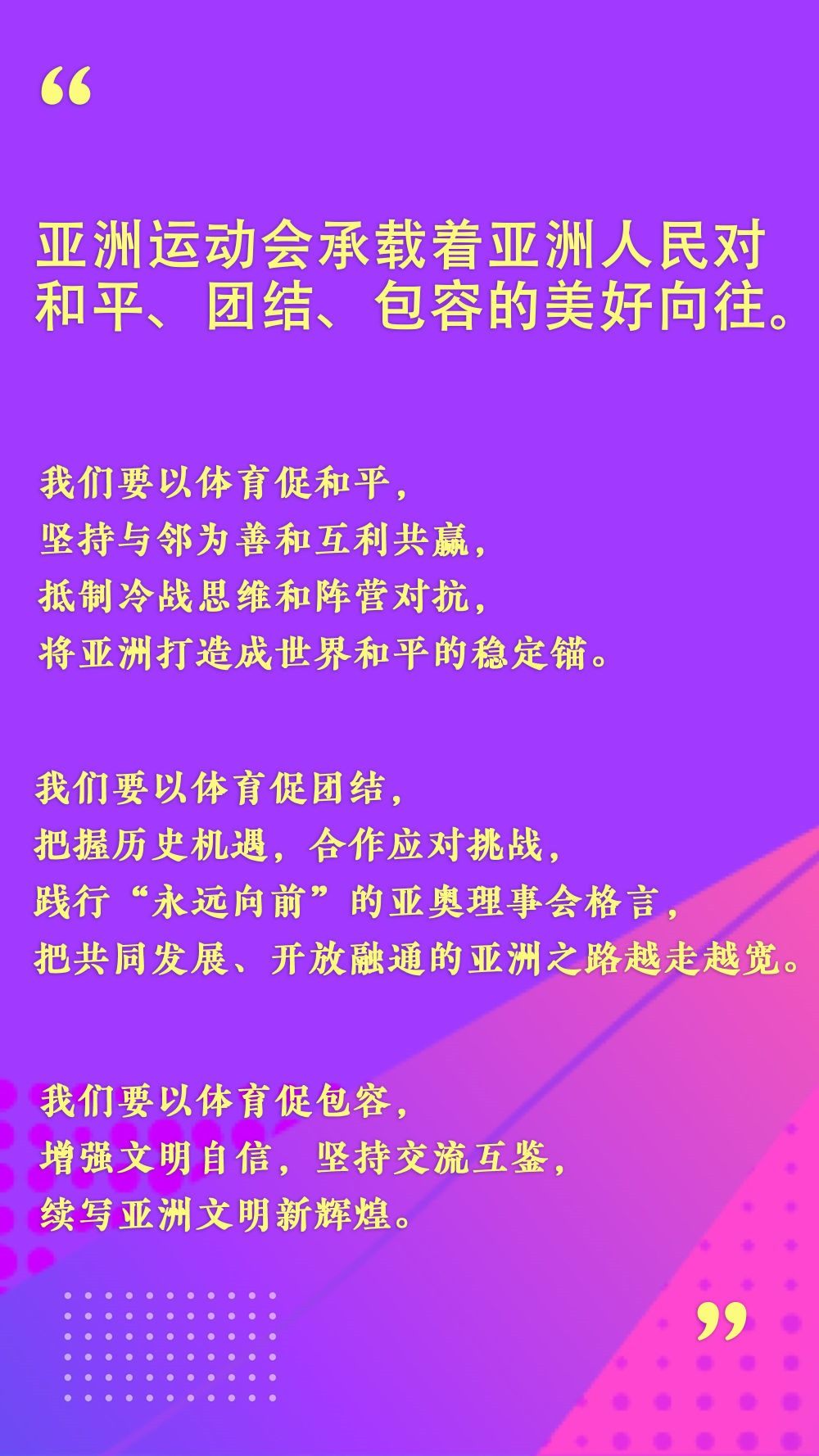 習(xí)近平在杭州第十九屆亞洲運(yùn)動會開幕式歡迎宴會上的致辭中強(qiáng)調(diào),亞洲運(yùn)動會承載著亞洲人民對和平、團(tuán)結(jié)、包容的美好向往。