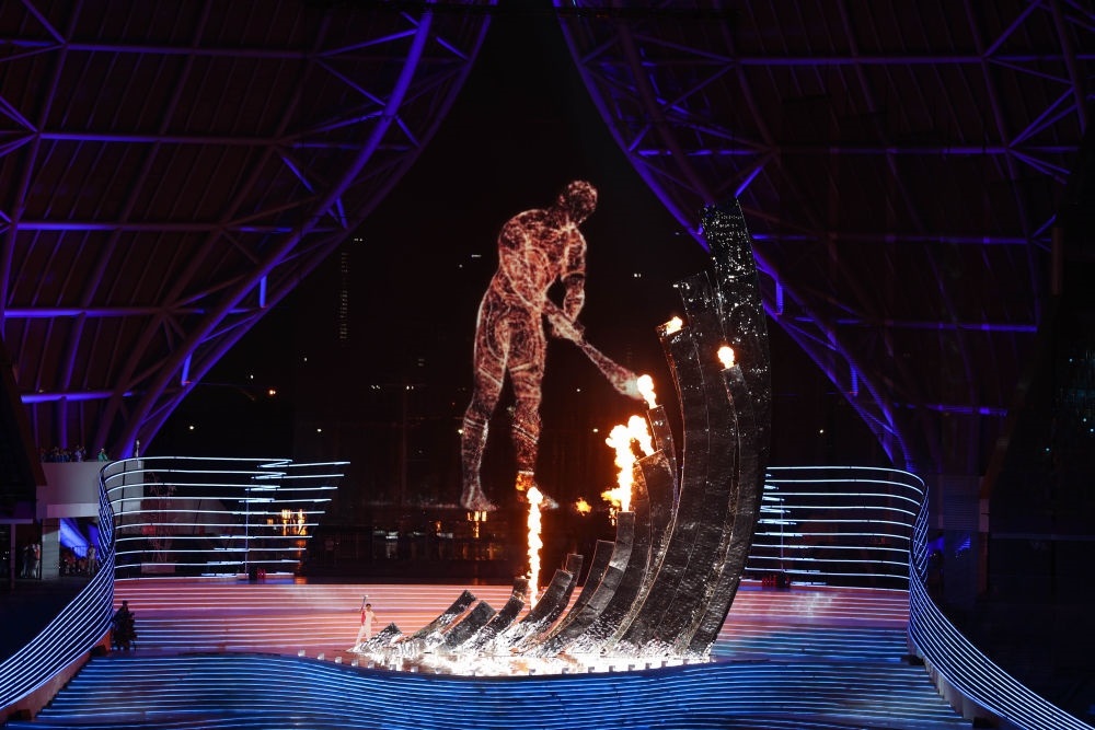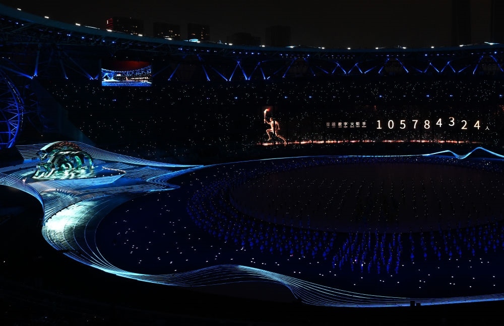 中國農(nóng)歷秋分節(jié)氣,杭州奧體中心體育場“大蓮花”燈光璀璨,萬涓成水,奔涌成潮。“數(shù)字火炬手”與游泳運(yùn)動員汪順共同點(diǎn)燃了象征亞洲大團(tuán)結(jié)的體育之火,杭州第十九屆亞運(yùn)會開幕。