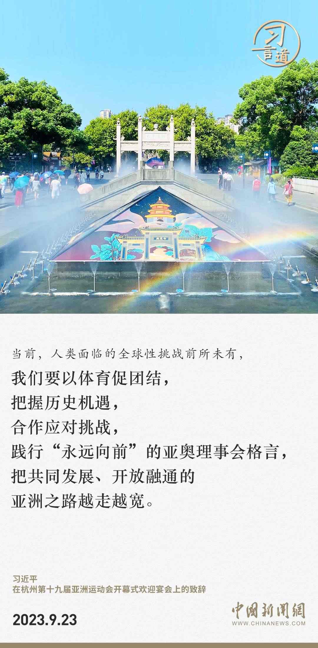 9月23日中午,國家主席習近平和夫人彭麗媛在浙江省杭州市西子賓館舉行宴會,歡迎來華出席杭州第19屆亞洲運動會開幕式的國際貴賓。習近平發(fā)表致辭指出——