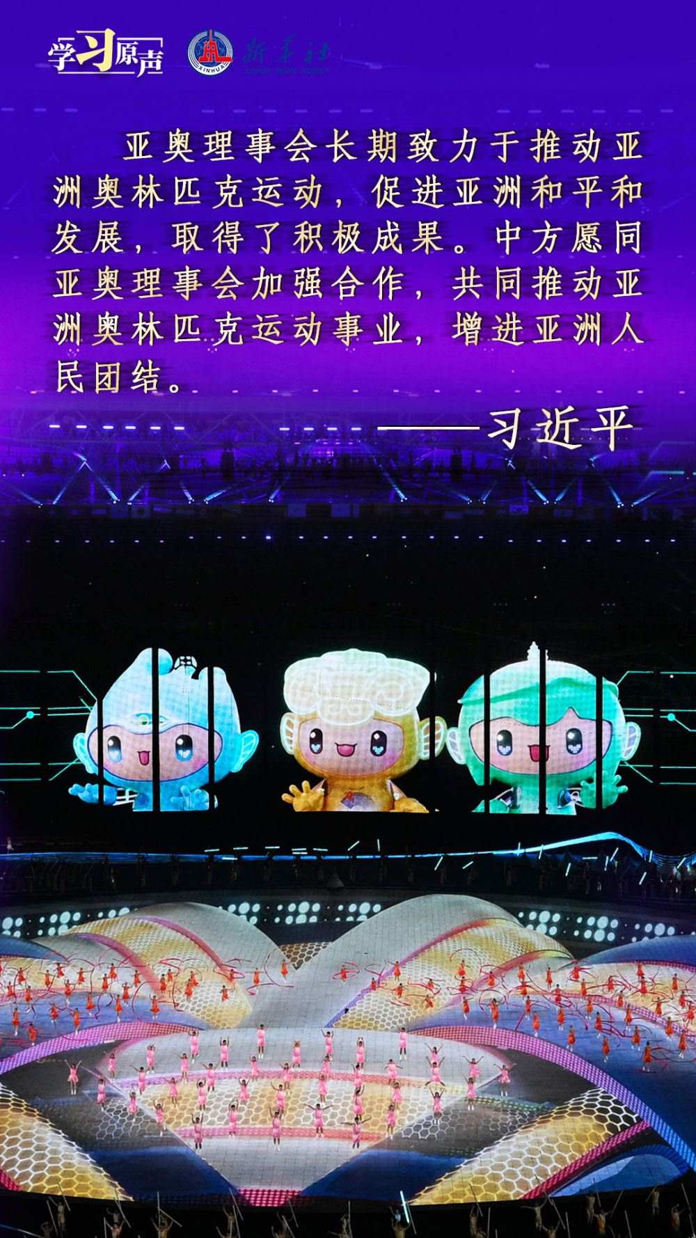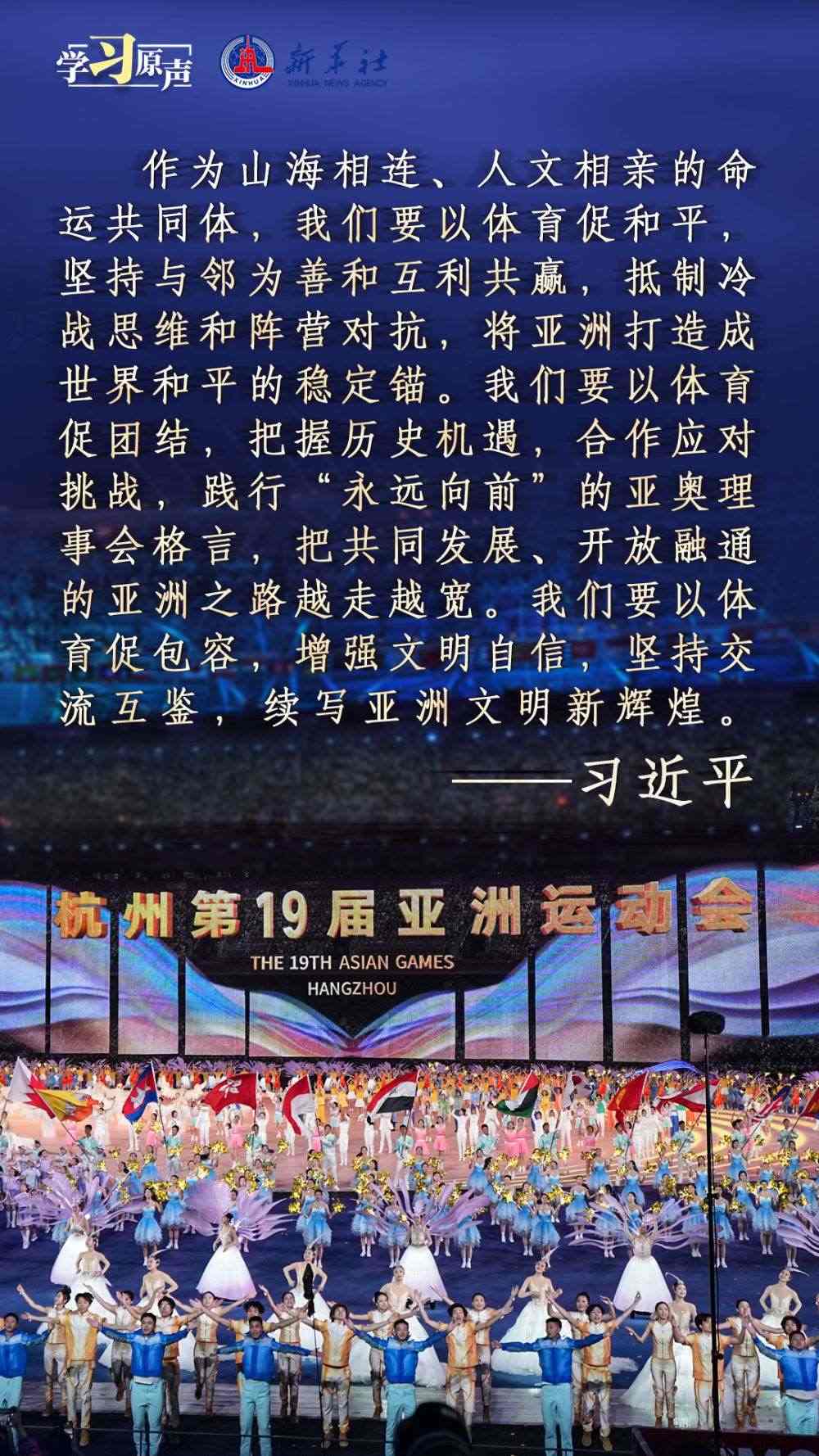 秋分時(shí)節(jié),舉世矚目的杭州第十九屆亞洲運(yùn)動(dòng)會(huì)隆重開幕?!皝喼捱\(yùn)動(dòng)會(huì)承載著亞洲人民對(duì)和平、團(tuán)結(jié)、包容的美好向往?!绷?xí)近平主席在杭州第十九屆亞洲運(yùn)動(dòng)會(huì)開幕式歡迎宴會(huì)上的致辭,傳遞著熱情友好的情誼,宣示了新時(shí)代中國(guó)推動(dòng)亞洲大家庭團(tuán)結(jié)合作的堅(jiān)定決心,為促進(jìn)亞洲和國(guó)際奧林匹克運(yùn)動(dòng)發(fā)展、共建亞洲命運(yùn)共同體注入強(qiáng)大信心與力量。