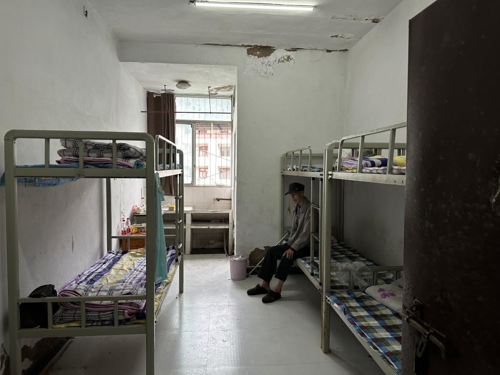 太白西村4組村民譚建和老爺爺行動不便,坐在鋪著干凈格子床單的宿舍床上望向窗外?!扒疤煜挛纾鐓^(qū)的車來接的我和老伴,安置點吃喝都好,宿舍住起來也挺舒服。兒子們擔(dān)心我,他們過不來,一天就打好幾通電話,我說都好著呢、好著呢?!弊T爺爺說。
