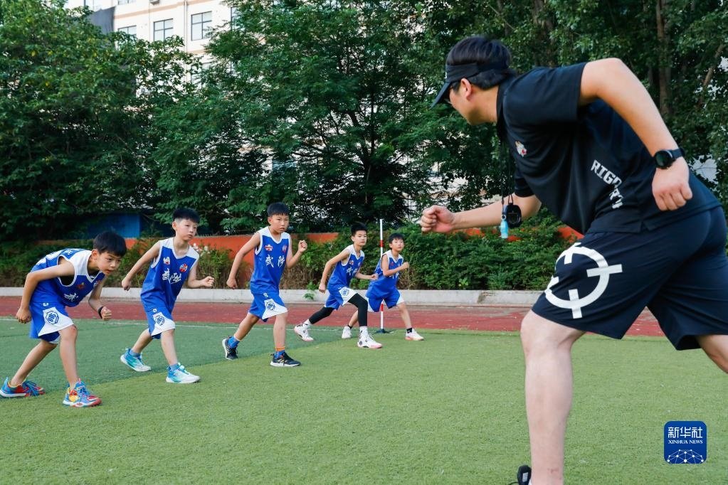 7月8日,在河南省駐馬店市汝南縣雙語(yǔ)學(xué)校,來(lái)自湖南大學(xué)的志愿者帶領(lǐng)孩子們一起做運(yùn)動(dòng)。