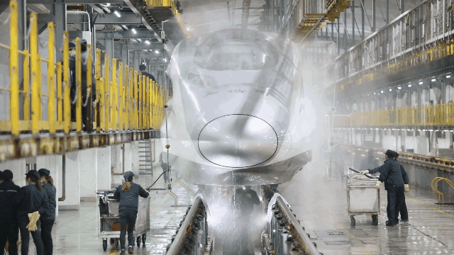 在外“奔波”了一整天的高鐵動車組回到動車所后,首先會沿著鋼軌來到洗車房“洗個澡”。當動車通過洗車房時,“機洗房”便自動開啟智能工作模式。列車以3至5公里的時速開過“澡堂”時,數十個“花灑”噴嘴會給車身預濕,之后的噴嘴噴灑專用“沐浴露”,斜刷、側刷、底刷快速投入工作。