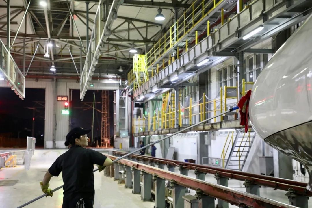 動車組經過洗車機時,調度室內調度員精準聯控司機,機房有專業(yè)的設備操作人員負責監(jiān)控,確保洗車機正常運轉,外皮清洗到位。在動車檢修庫內,質檢員全方位卡控人工清洗環(huán)節(jié),檢查清潔是否到位。