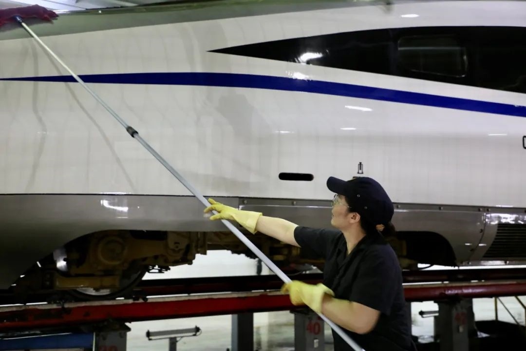 經過自動清洗的動車組在開進動車所檢修庫后,將由洗車人員進行深度清潔。20多名洗車人員分工協作對動車組車頂、車身等各部位進行清洗。